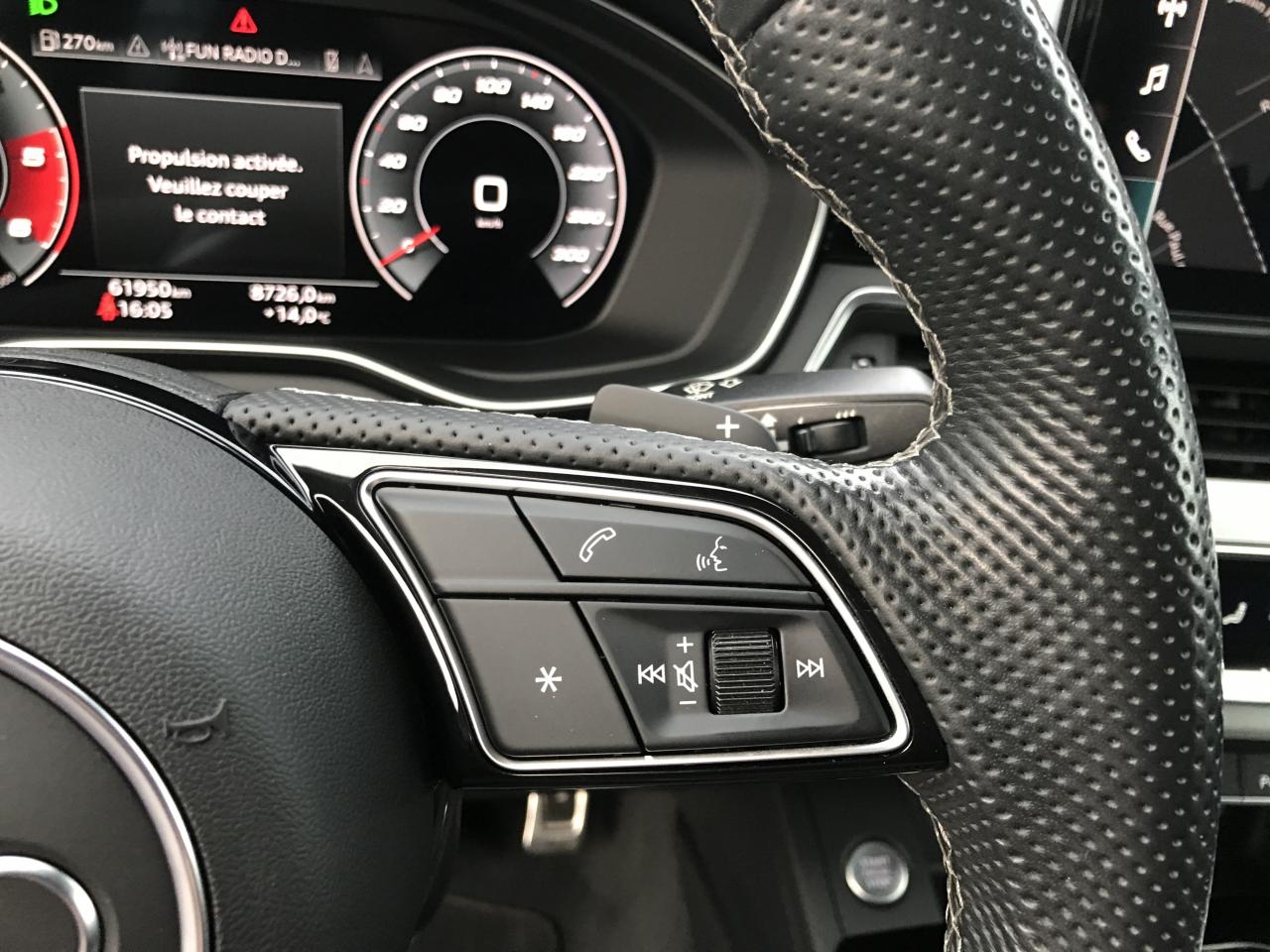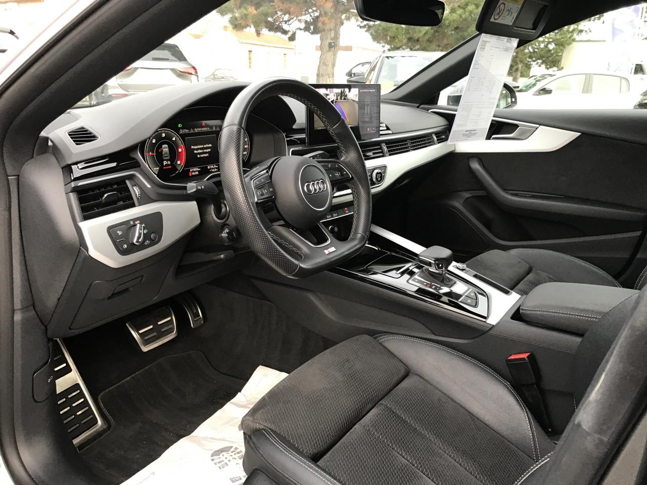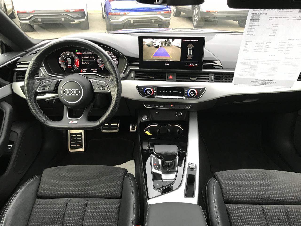Technologie hybride léger - Mild-HybridAccoudoir central AV confort avec inclinaison réglable et coulissant en longueurAffichage du contrôle de la pression des pneusAirbags latéraux à l'AV et système d'airbags de têteAppel d'urgence et service Audi connect avec commande du véhiculeApplications décoratives en Aluminium brossé matAppui lombaire à 4 axes pour les sièges AV: réglages électrique, horizontal et verticalAppuie-têtes variables pour les sièges AV avec réglage manuel de la hauteur et de la distance de l'appuie-têteAudi Connect avec carte SIM intégrée (e-SIM) et licence d'utilisation pour 3 ansAudi Drive Select Permet de sélectionner différents modes de conduite: Efficiency, Confort, Dynamic, Individual. Les systèmes et équipements du véhicules s'adaptent suivant le mode sélectionnéAudi Hold AssistAudi Hold AssistAudi Parking System PlusAudi Parking System PlusAudi phone box lightAudi phone box lightAudi Pre Sense cityAudi smartphone interface (Apple CarPlay ou Google Android Auto)Audi smartphone interface (Apple CarPlay ou Google Android Auto)Audi Sound SystemAudi Virtual Cockpit PlusAugmentation de la capacité du réservoir à carburant à 54 litresBaguette enjoliveuse AR en argent aluminium matBande élastique à gauche et à droite dans le coffreBanquette AR 3 places avec appuie-tête en L réglables en hauteurBoîte à gants verrouillableCalandre spécifique S line laquée en noir titaneCaméra de reculCaméra de reculCaméra multifonctionCeintures de sécurité, automatiques à 3 points pour tous les sièges, contrôle de port de ceinture AVChâssis SportCiel de pavillon en tissu noirCoffre à ouverture et fermeture électriquesColonne de direction de sécuritéCommande de désactivation de l'airbag passager AVCommande intérieure des portières AV/ARDiffuseur avec finition symétrique des sorties d’échappement de style en chrome à gauche et à droiteDiffuseur spécifique "S line" en Noir Titane matDirection assistée électromécaniqueDispositif anti-erreur de carburantEclairage d'ambiance de la console centrale AVEclairage d'ambiance des portières AV/AREclairage dans la zone des pieds AVEclairage dans la zone des pieds AV/AREclairage des seuils de portières AVEclairage du porte-boissons AVEclairage intérieur Module de pavillon avant et arrière incluant spots de lecture, commande capacitive à l’avant, éclairage d’ambiance de la console centrale, boîte à gants éclairée, éclairage passif des portières, &eacEclairage périphérique dans les poignées de portières extérieuresEcrous de roues antivolEmblème S-Line sur les ailes AVExtensions de bas de caisse couleur carrosserieExtentions de bas de caisse couleur carrosserieFilet de rangement au dos des sièges AVFixation pour sièges enfants ISOFIX et Top Tether pour les places AR extérieuresGrilles d’entrée d’air latérales en noir mat grainé avec insert en argent aluminium matIdentification du modèle selon le nouveau marquage de puissanceInterfaces de charge USB pour les passagers ARInterfaces de charge USB pour les passagers ARJantes en aluminium coulé 18" style 5 branches doubles 8.5Jx18", avec pneus 245/40 R18Keyless Go: démarrage et arrêt du moteur par touche moteur Start/Stop sur la console centraleLimitation de la vitesse maximale à 210 km/hMiroirs de courtoisie éclairésMoulures de seuil avec insert en aluminium AV, éclairées, avec inscription SNavigation MMI plus avec MMI touchPédalier et repose-pieds en acier inoxydablePack Brillance ExtérieurPack Navigation MMI plus avec MMI touchPare-chocs spécifique S à l’AV et à l’ARPare-soleil côtés conducteur et passager AVPneus à roulage optimisé (faible résistance au roulement), 245/40 R 18 - Vmax = 210 km/hPorte-gobelets dans l'accoudoir central ARPréparation pour crochet d'attelageProjecteurs Matrix LED et feux AR à LED avec clignotants dynamiquesProtection antidémarrage électroniqueRéception radio numérique (DAB) ajoute à l'offre de radios analogiques la réception de stations numériques selon le standard DAB, incluant DAB+ et DMB AudioRégulateur/Limiteur de vitesseRéservoir AdBlue à capacité étendue (24 litres)Rétroviseur intérieur sans encadrement jour/nuit automatiqueRétroviseurs extérieurs avec feux clignotants à LED intégrés et dans la teinte du véhiculeRétroviseurs extérieurs réglables et escamotables électriquement, jour/nuit automatique, dégivrants des deux côtés et buses de lave-glaces dégivrantesSécurité enfantsSièges AV SportSurfaces d’accentuation façon verre en noir pour le tableau de bord, les caches des rebords de portière et l’insert de la console centraleSystème Start & StopTapis complémentaires AV/ARTire Mobility System Compresseur et produit de colmatage en cas de crevaisonVide-poches côté conducteurVitres athermiquesVolant Sport contour en cuir style 3 branches, aplati en bas, avec multifonction plus avec palettes de changement de vitesse et avec logo S line et poignées de volant en cuir perforé
