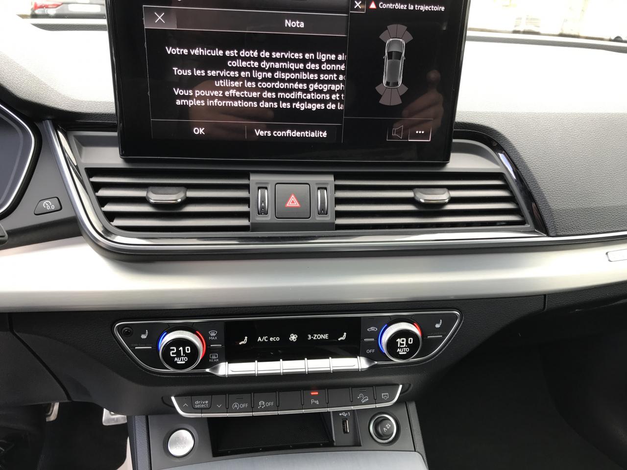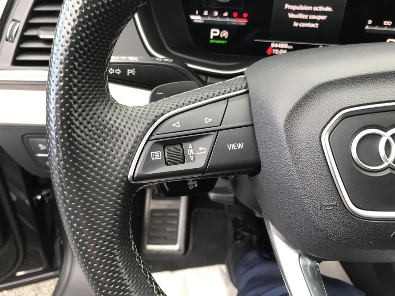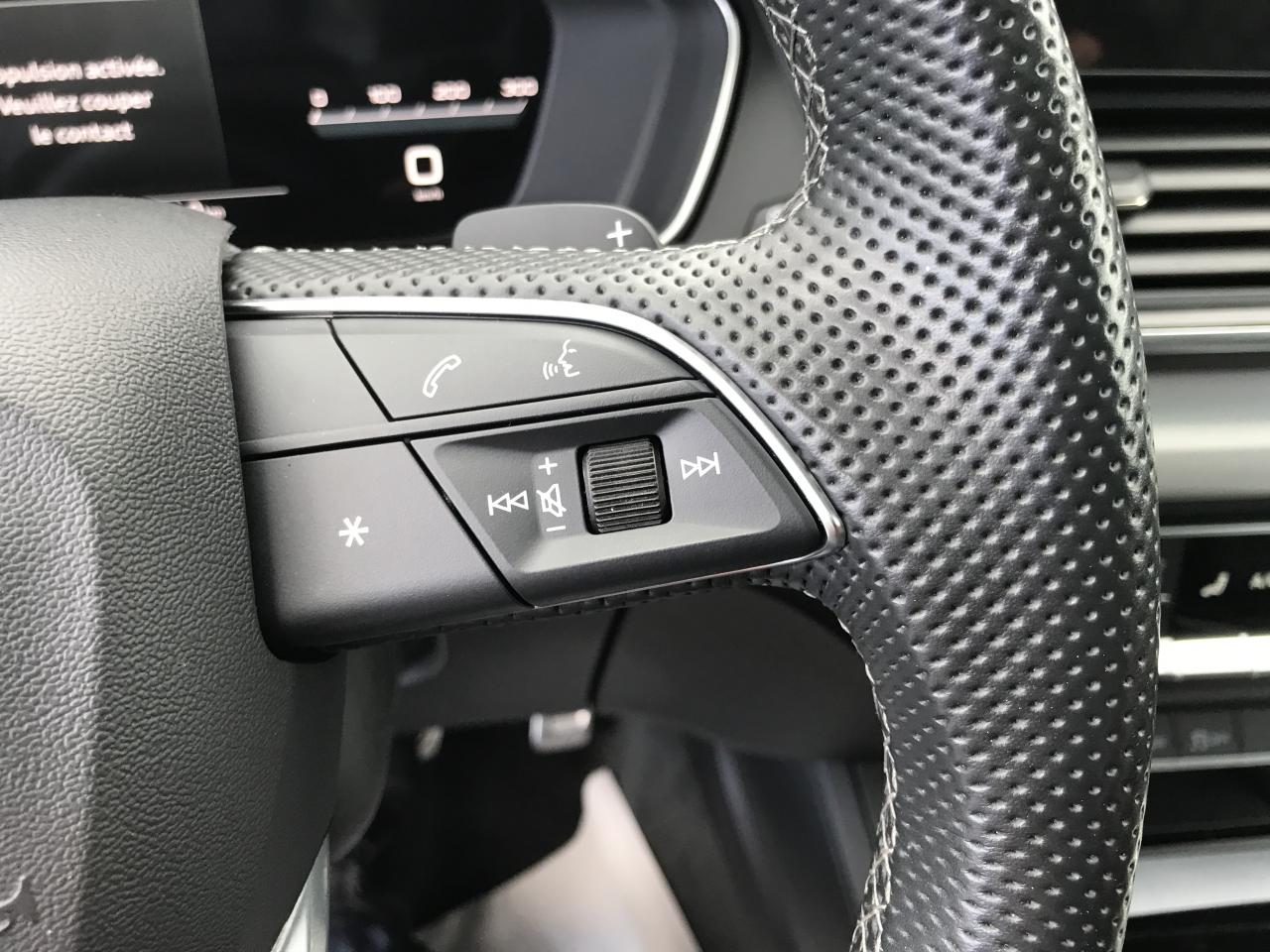 Technologie Mild HybridAccoudoir central AVAffichage de perte de pression des pneusAirbags latéraux AV avec système d'airbags de têteAppel d'urgence avec service Audi connect + commande de véhiculeApplications décoratives en Aluminium brossé matAudi connect avec carte SIM intégrée (e-SIM) et licence d'utilisation pour 3 ansAudi drive selectAudi Hold AssistAudi Parking System Plus: Système accoustique et visuel d'aide au stationnement AV et ARAudi Pre-Sense CityAudi Smartphone Interface (Apple CarPlay / Google Android Auto)Audi Sound System : amplificateurs 6 canaux, 10 HP dont 1 central dans le tableau de bord et 1 subwoofer, puissance totale 180 WAudi Virtual Cockpit PlusAugmentation de la capacité du réservoir à carburant à 70 litresBaguette le long du pavillon et sur les appuis de vitre en aluminium anodiséBanquette AR plusBoîte à gants verrouillableCaméra multifonctionCeintures de sécurité automatiques à 3 points pour tous les sièges, contrôle de port de ceinture AVCiel de pavillon en Tissu NoirClé Confort (Keyless entry) + Keyless goClimatisation automatique Confort 3 zonesColonne de direction de sécuritéCommande de désactivation de l'airbag passager AVDirection assistée électromécaniqueDispositif anti-erreur de carburantFilet dans le logement gauche du coffreFilet de coffreFilet de rangement au dos des sièges AVFinition extérieure S lineFixation pour sièges enfants ISOFIX et Top Tether pour les sièges extérieurs ARHayon de coffre assisté électriquement pour l'ouverture et la fermetureIdentification du modèle selon le nouveau marquage de puissanceInterface BluetoothLave-phares haute pressionMoulures de seuil avec insert en aluminium AV, éclairées, avec inscription SNavigation MMI plus avec MMI touchOutillage de bord (sans cric)Pédalier et repose-pied en acier inoxydablePare-soleil côtés conducteur et passager AVPorte-boissons dans l’accoudoir central ARPréparation pour crochet d'attelageProtection antidémarrage électroniqueRéception radio numérique (DAB) ajoute à l'offre de radios analogiques la réception des stations numériques avec une meilleurs qualité sonore, incluant DAB+ et DMB AudioRégulateur de vitesse incluant limiteur de vitesseRéservoir d'AdBlue à 24 litresRétroviseur intérieur jour/nuit automatique sans encadrement (Frameless)Rétroviseurs extérieurs avec clignotants à LED intégrés couleur carrosserieRétroviseurs extérieurs réglables et escamotables électriquement, jour/nuit automatique, dégivrants des deux côtés et buses de lave-glaces dégivrantesRevêtement noir brillant sur les montants de pavillon centraux et les triangles de portières ARSécurité enfants manuelleSangle de serrage à droite dans le coffreSangle de serrage à gauche et à droite dans le coffreSièges AV réglables manuellement en hauteur et en profondeur ; réglage manuel des appuie-tête en hauteurSièges Sport à l'AVSuppression des rampes de pavillonSurfaces d'accentuation façon verre en NoirSystème Start/StopTapis complémentaires AV/ARTapis de coffre à bagagesTire Mobility SystemTrousse de secours et triangle de présignalisationVide-poches côté conducteurVitres AR surteintées (Vitrage Privacy)Vitres athermiquesVolant Sport contour en Cuir style 3 branches aplati en bas avec multifonction plus avec palettes de changement de vitesses