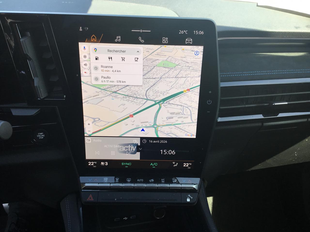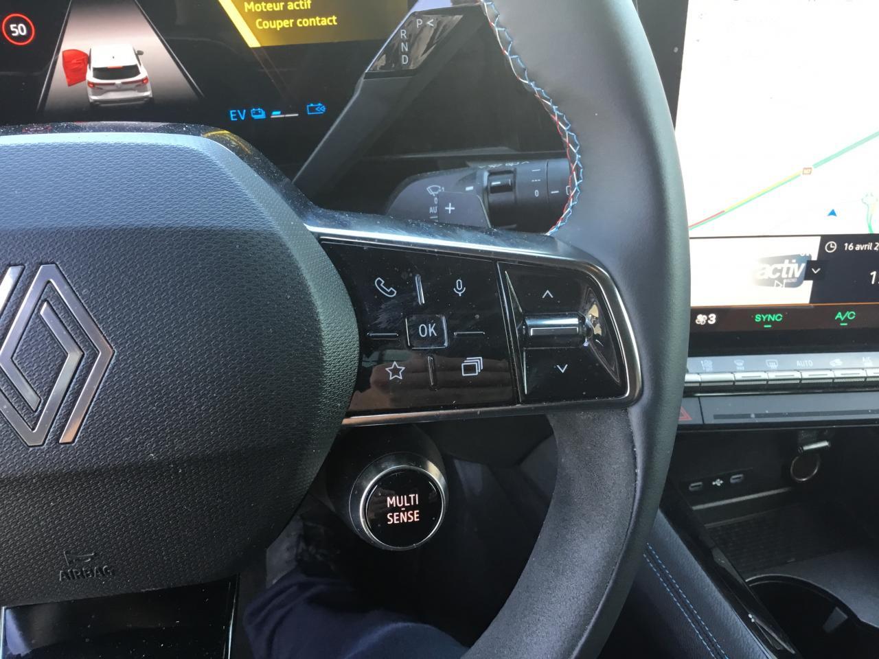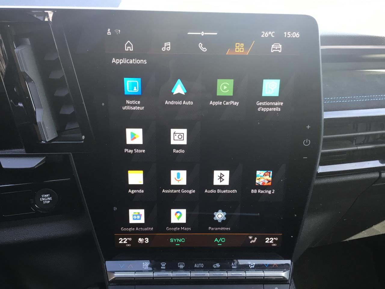 ABS avec aide au freinage d'urgence2 prises USB à l'AV et à l'ARAide au freinage d'urgenceAide au parking AV/AR et latéralAirbags frontaux (conducteur et passager)Airbags latéraux bassin / thorax conducteur et passager AVAirbags latéraux, milieu AV et rideauxAlerte détection de fatigueAlerte de distance de sécuritéAlerte franchissement de ligne et assistant maintien dans la voieAppel d'urgenceAppuis-tête AV réglablesBanquette AR 1/3 2/3Barres de toit longitudinalesCaméra de reculCarte Renault accès et démarrage mains libresChargeur smartphone à inductionCiel de toit gris anthraciteClignotants AR dynamiquesClimatisation automatique bi-zoneCommutation automatique des feux de route/croisementConsole centrale avec repose main coulissantDétection intelligente des limitations de vitesse et prévention survitesseFaux plancher de coffreFeux AR à LED avec effet 3DFeux AV full LED Adaptative VisionFeux de jour à LEDFrein de parking électrique avec fonction Auto-HoldJantes alliage 20" Daytona diamantées noirLève-vitres AR électriques à impulsionLève-vitres AV électriques à impulsionLumière d'ambiance personnalisableMiroir de surveillance enfantsMulti-senseMy Safety switch (raccourci vers configuration personnalisée des aides à la conduite)Navigation Google MapsPack Design esprit Alpine extérieurPack Design esprit Alpine intérieurPalettes au volantPré-équipement alarmePrédisposition éthylotestRégulateur de vitesse adaptatifRétroviseur intérieur électrochrome sans cadreRétroviseurs extérieurs électriques, dégivrants, rabattables automatiquementSellerie mixte tissu carbone / alcantara avec surpiqûres bleuesSeuil de portesSiège conducteur et passager avec réglage en hauteurSièges avec système ISOFIXSystème de surveillance de la pression des pneusSystème Multimédia openR link 12" : navigation, services Google, audio Arkamys AuditoriumTableau de bord full numérique 12,3''Volant réglable en hauteur et profondeur